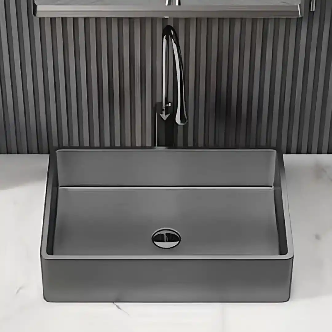 Gri tonlarındaki PVD kaplama, lavaboya modern ve zarif bir görünüm kazandırır. Dikdörtgen formu, hem estetik hem de işlevsellik açısından banyonuza değer katar.