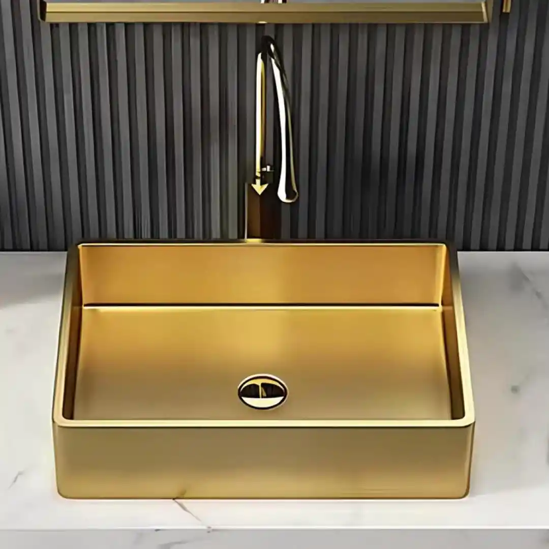 Altın rengi PVD kaplama, lavaboya modern ve zarif bir görünüm kazandırır. Dikdörtgen formu, hem estetik hem de işlevsellik açısından banyonuza değer katar.