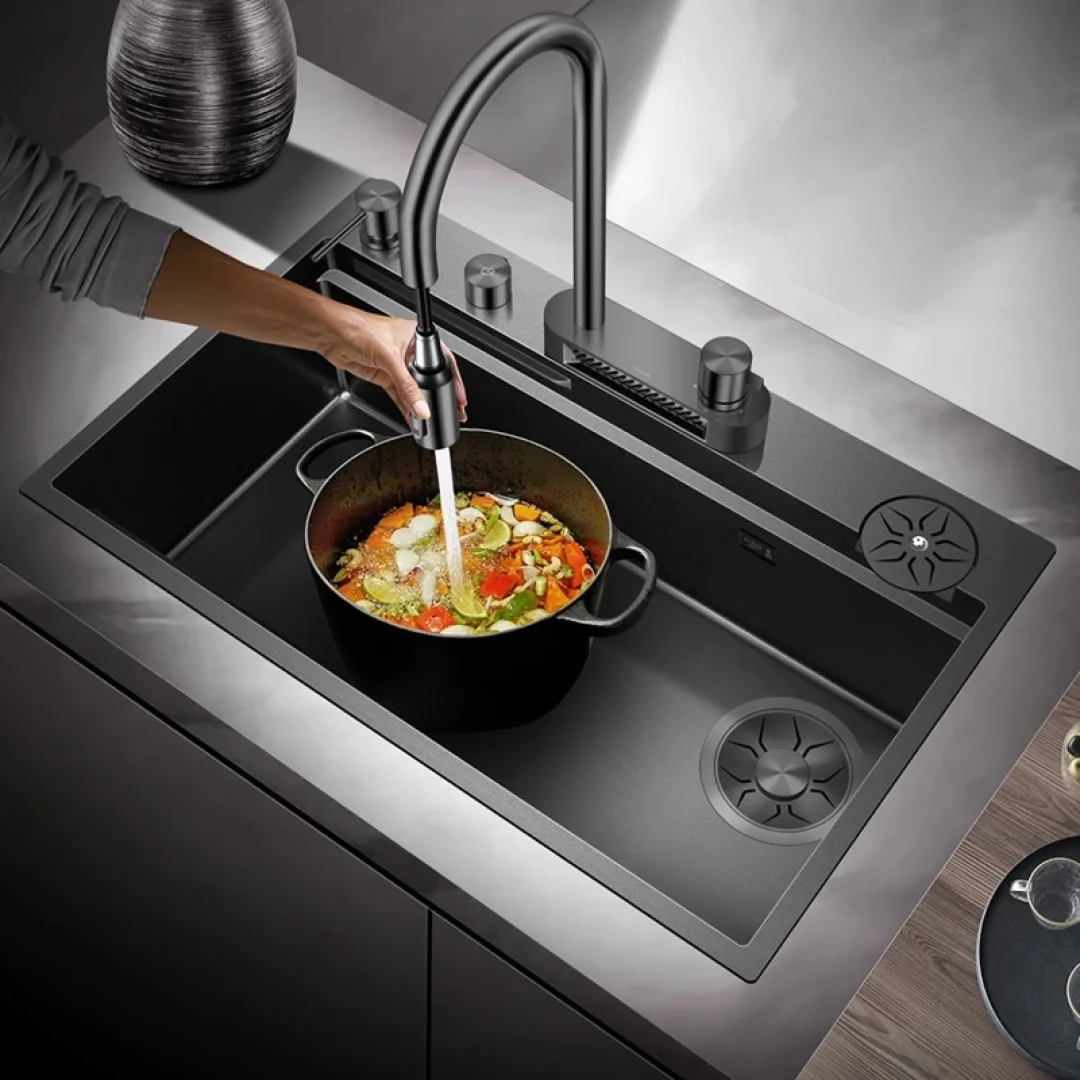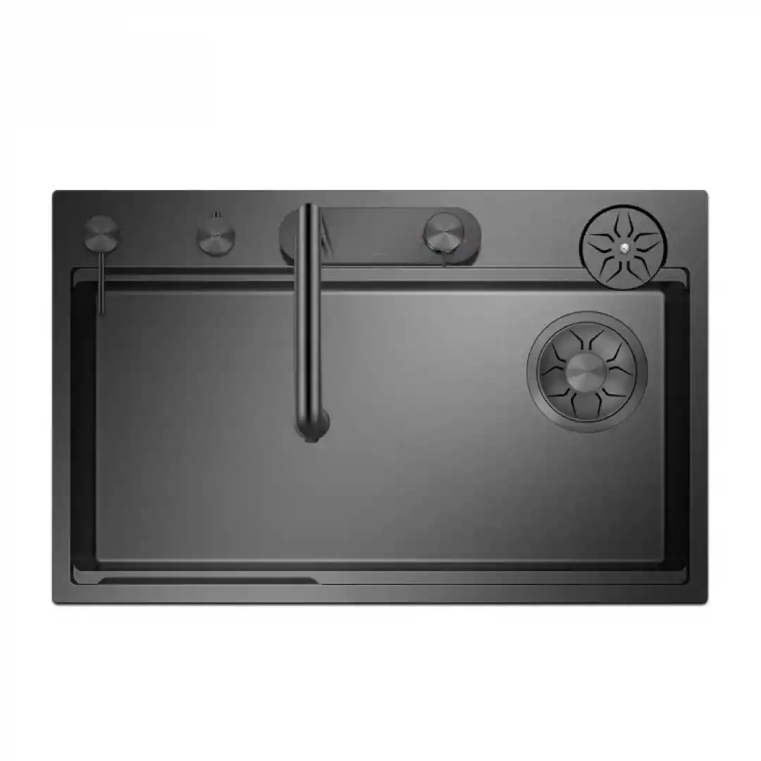 78x50 cm ölçülerindeki evye, derin ve geniş tek hazne tasarımına sahiptir. Bu tasarım, büyük tencere ve tavalarla çalışmayı kolaylaştırır. 20 cm'ye varan derinlik, su sıçramalarını minimize eder ve daha konforlu bir kullanım deneyimi sunar. Modern köşeli tasarımı ve mat siyah rengi ile her türlü mutfak dekoruna uyum sağlar.
