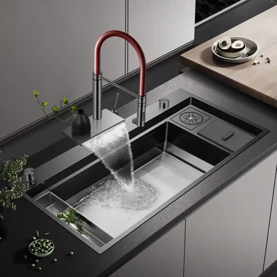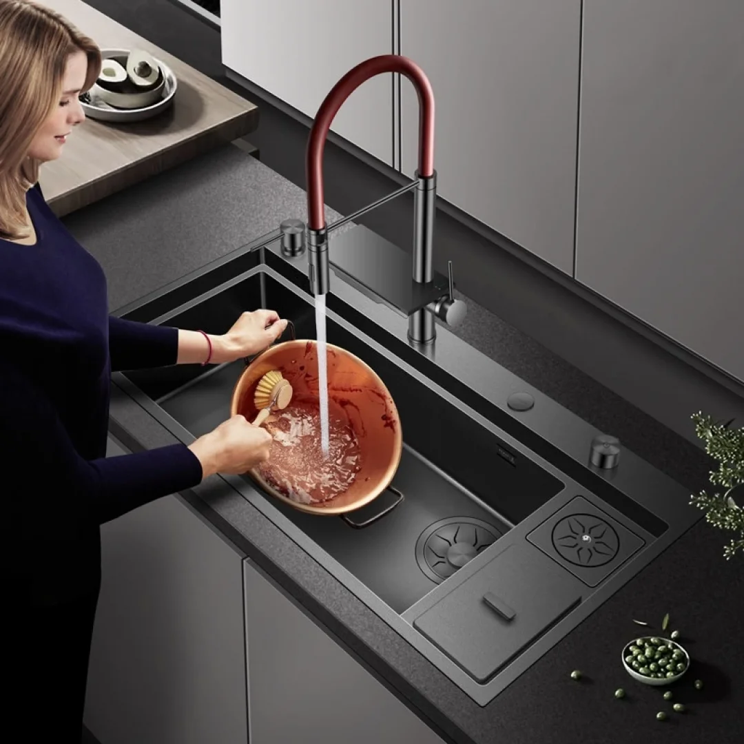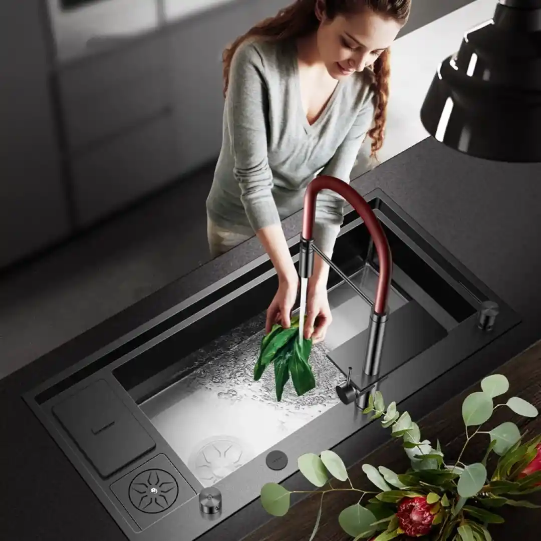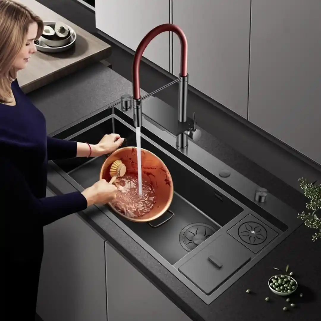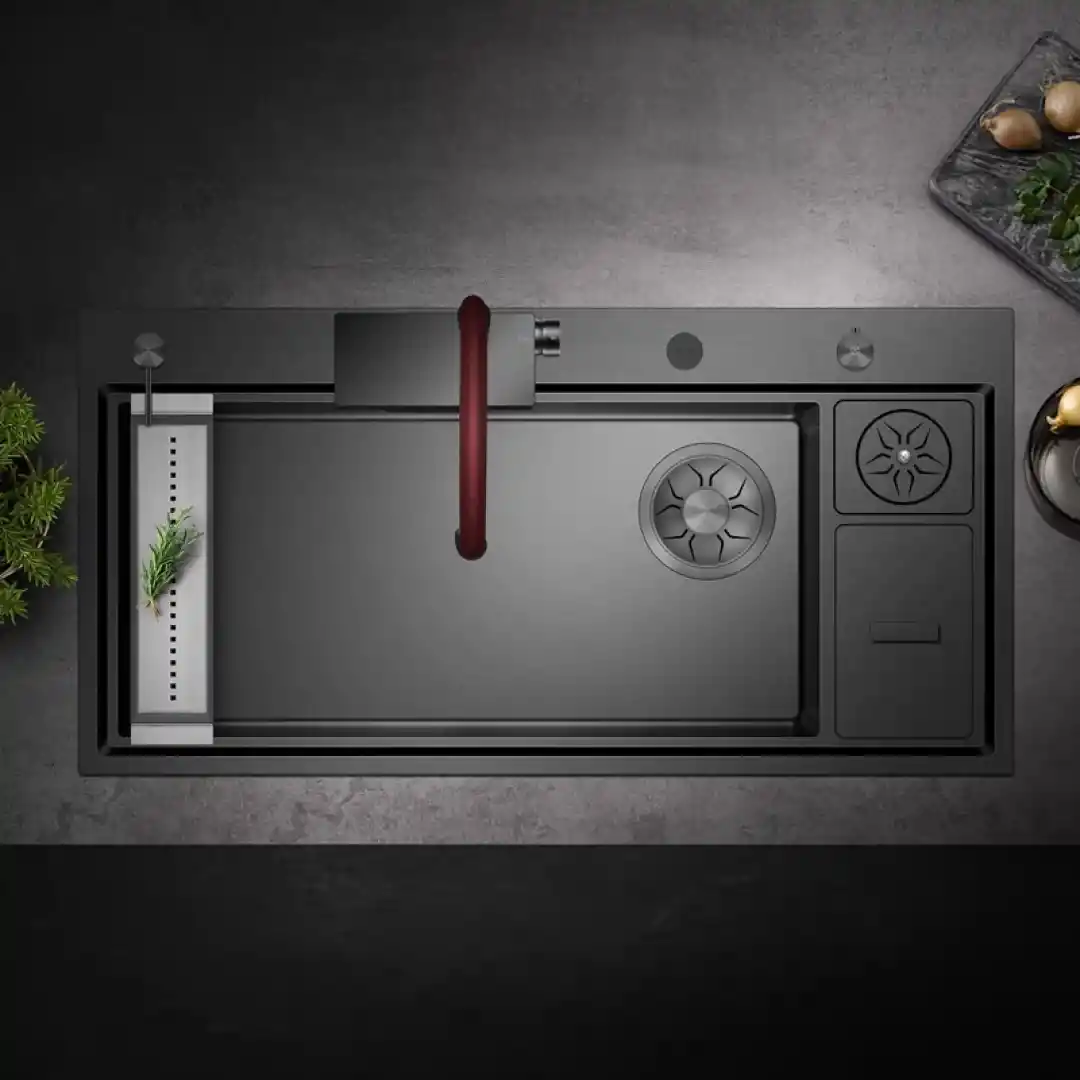 Evye yüzeyinin düz yapısı ve PVD kaplama sayesinde, kir ve su lekeleri yüzeye tutunmaz. Bu özellik, evyenin hijyenik kalmasını sağlar ve temizlik süresini minimuma indirir. Ayrıca, otomatik sifon sistemi sayesinde su birikintileri oluşmaz, böylece bakteri oluşumu engellenir.