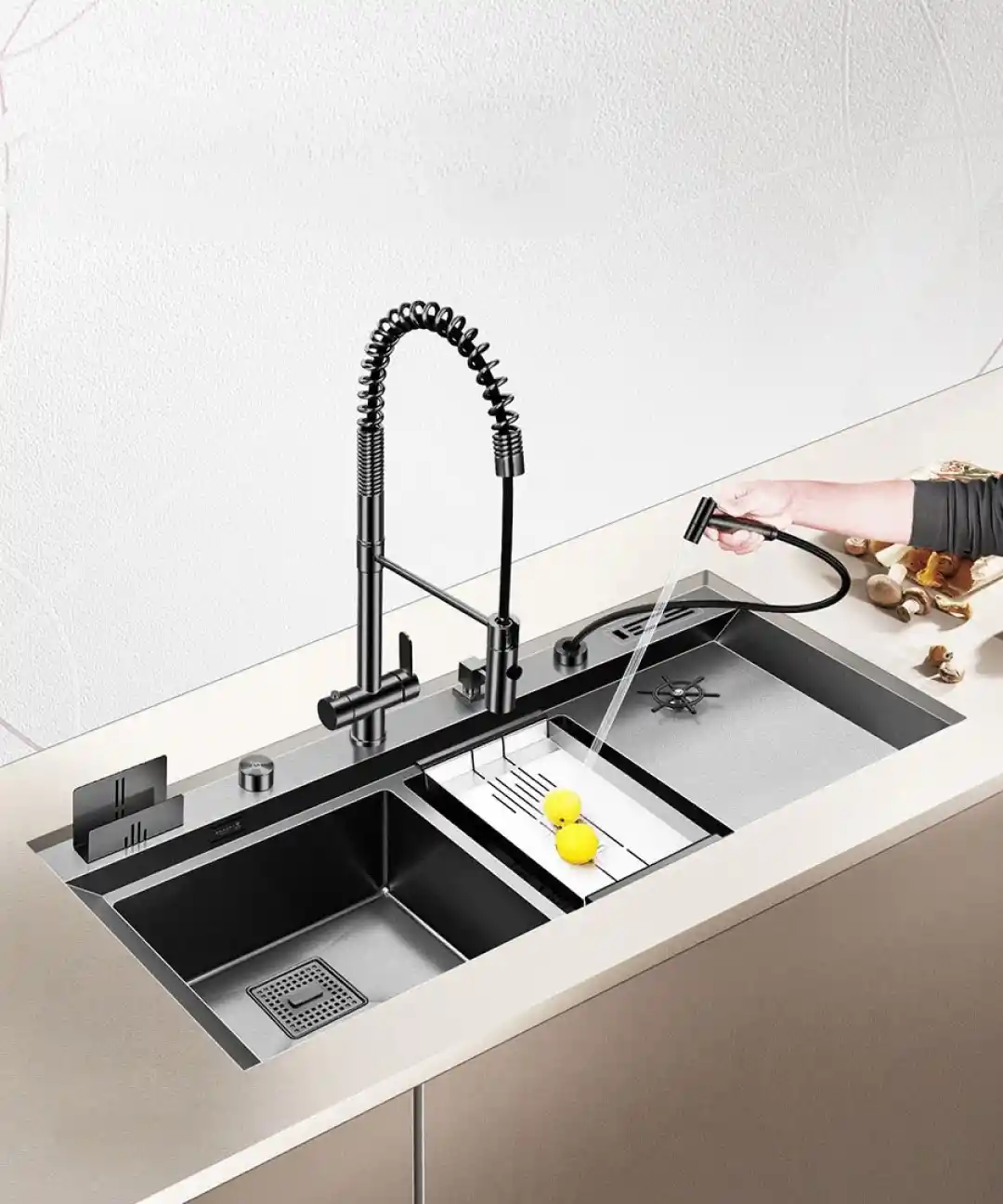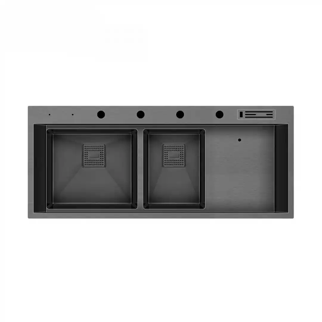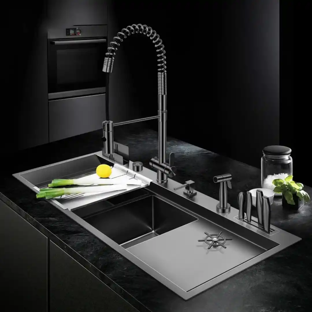 Evye yüzeyinin düz yapısı ve PVD kaplama sayesinde, kir ve su lekeleri yüzeye tutunmaz. Bu özellik, evyenin hijyenik kalmasını sağlar ve temizlik süresini minimuma indirir. Ayrıca, otomatik sifon sistemi sayesinde su birikintileri oluşmaz, böylece bakteri oluşumu engellenir.