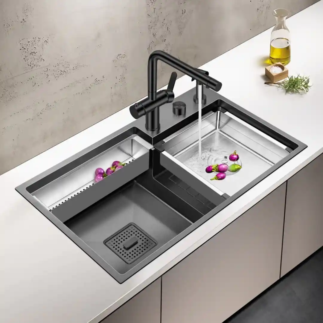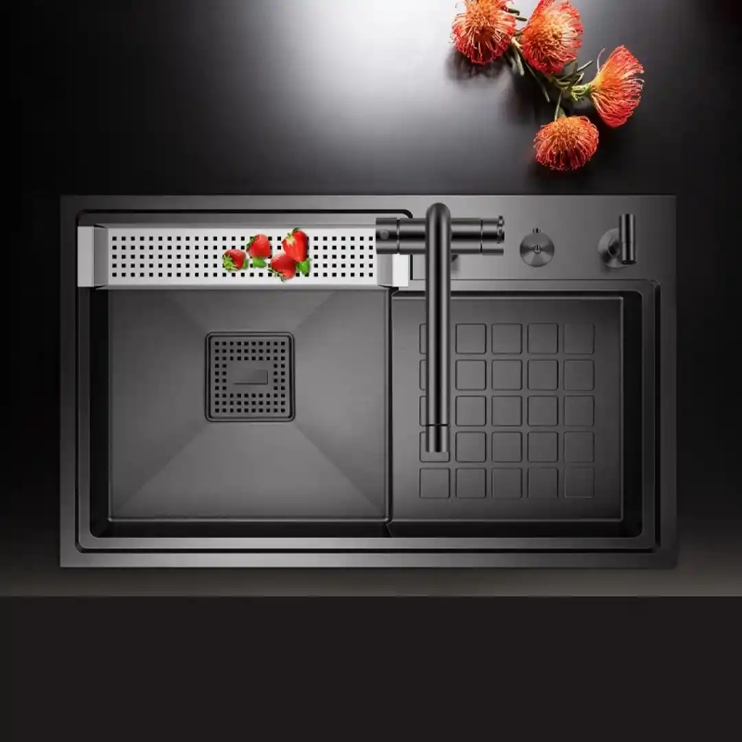 Evye yüzeyinin düz yapısı ve PVD kaplama sayesinde, kir ve su lekeleri yüzeye tutunmaz. Bu özellik, evyenin hijyenik kalmasını sağlar ve temizlik süresini minimuma indirir. Ayrıca, otomatik sifon sistemi sayesinde su birikintileri oluşmaz, böylece bakteri oluşumu engellenir.