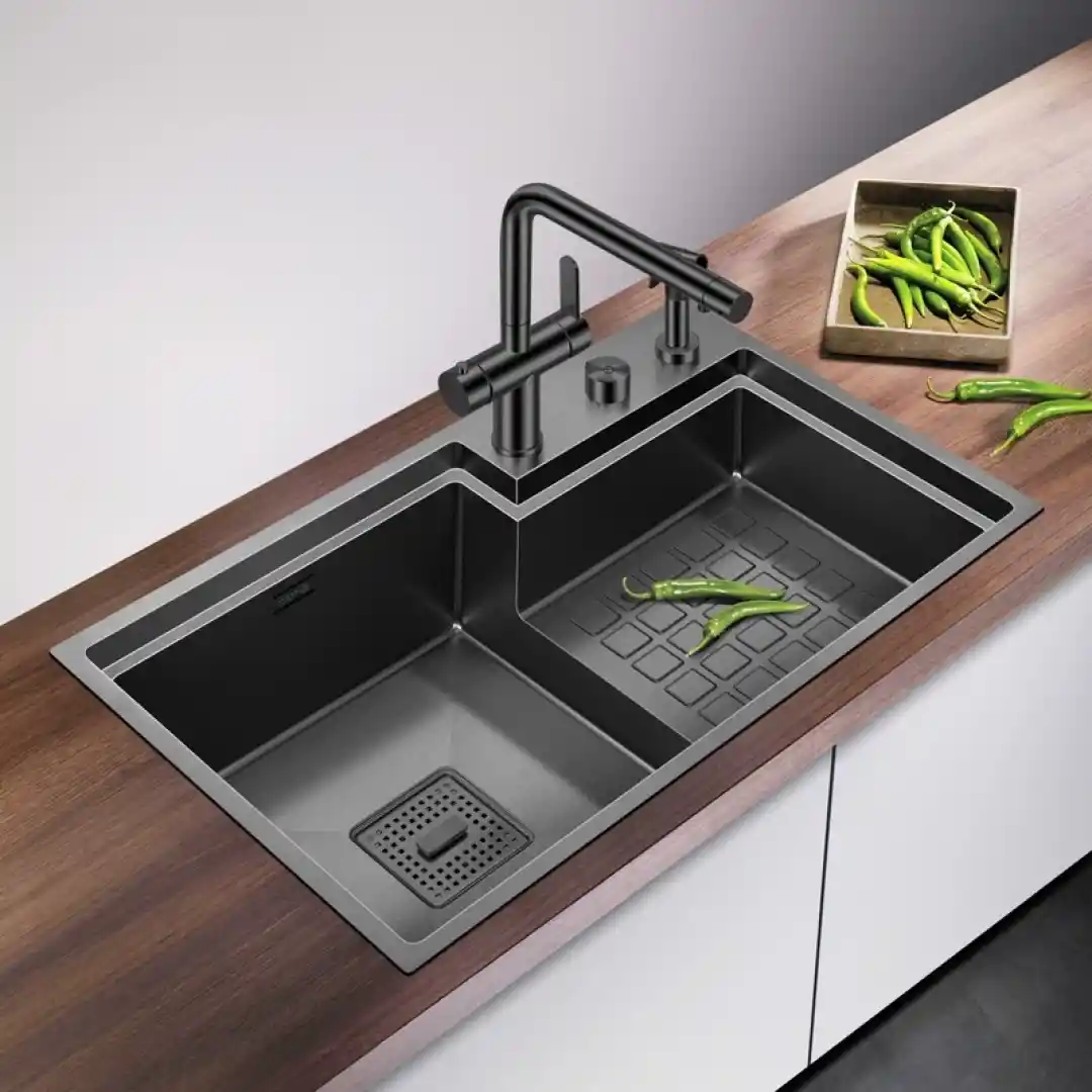 Bu evye, yüksek kaliteli SUS 304 paslanmaz çelikten üretilmiştir. 1.2 mm kalınlığındaki çelik yapısı sayesinde darbelere karşı dayanıklıdır ve uzun ömürlü kullanım sağlar. Ayrıca, PVD kaplama teknolojisi ile çizilmelere ve aşınmalara karşı ekstra koruma sunar.