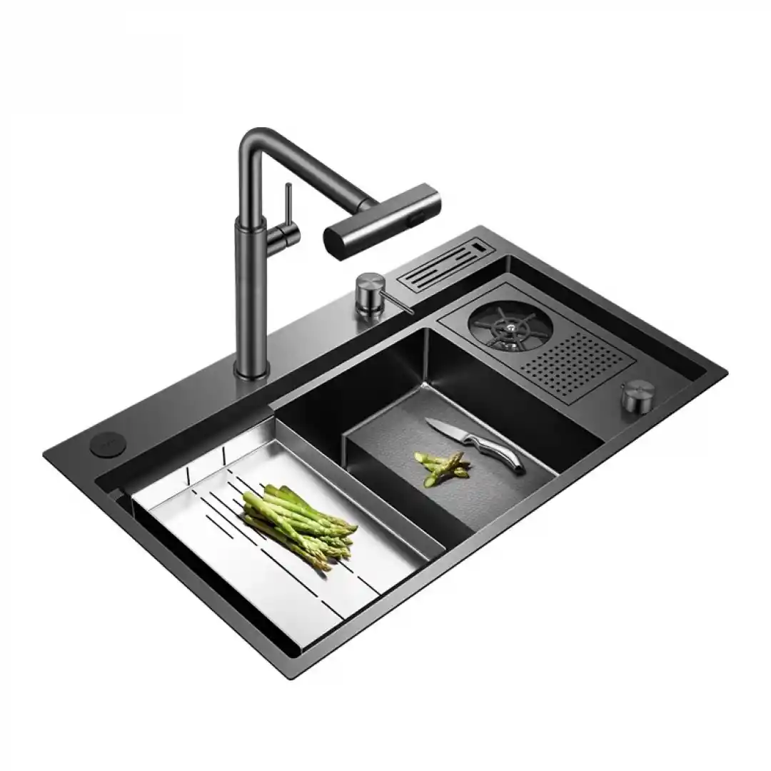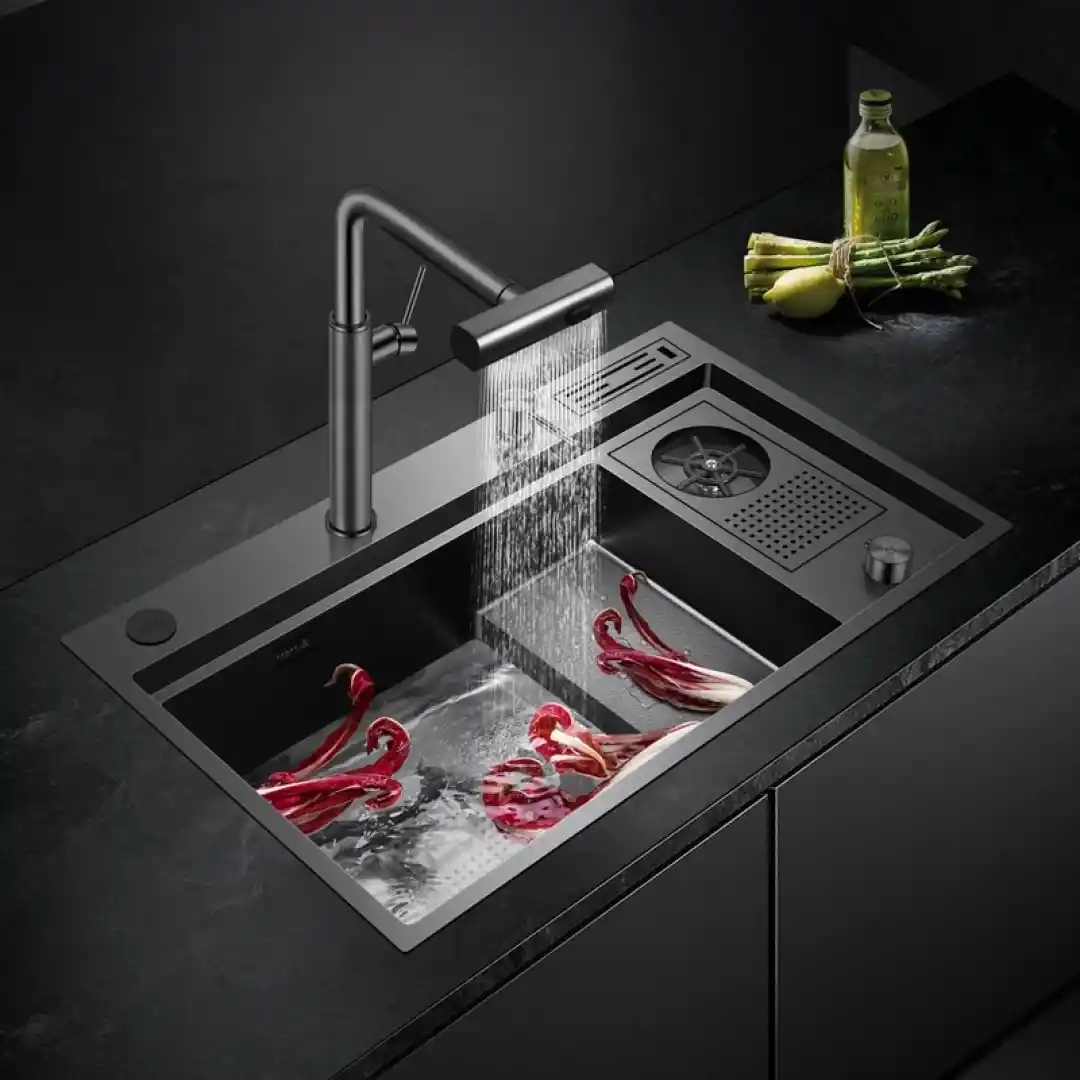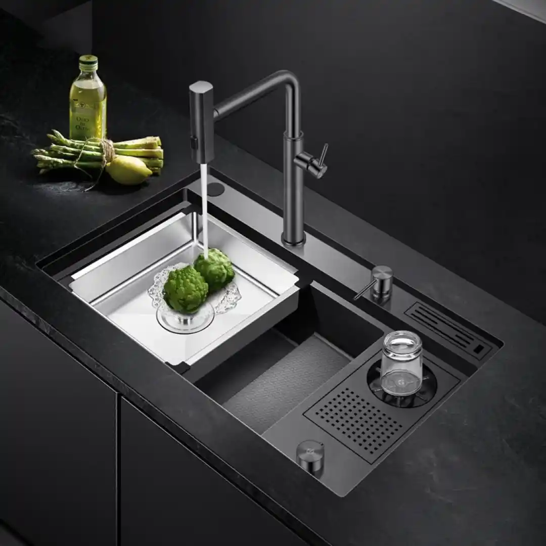Evye yüzeyinin düz yapısı ve PVD kaplama sayesinde, kir ve su lekeleri yüzeye tutunmaz. Bu özellik, evyenin hijyenik kalmasını sağlar ve temizlik süresini minimuma indirir. Ayrıca, otomatik sifon sistemi sayesinde su birikintileri oluşmaz, böylece bakteri oluşumu engellenir.