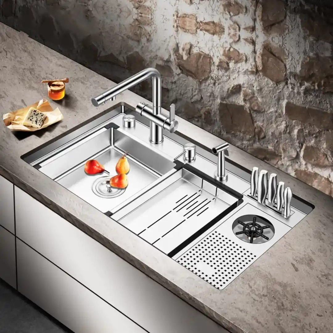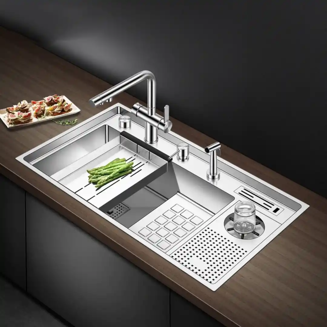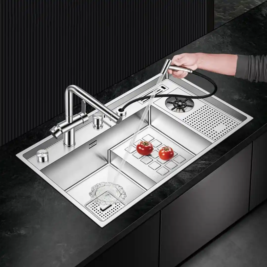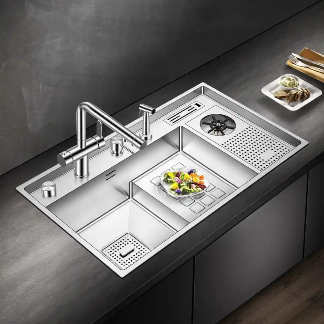 Evye yüzeyinin düz yapısı ve PVD kaplama sayesinde, kir ve su lekeleri yüzeye tutunmaz. Bu özellik, evyenin hijyenik kalmasını sağlar ve temizlik süresini minimuma indirir. Ayrıca, otomatik sifon sistemi sayesinde su birikintileri oluşmaz, böylece bakteri oluşumu engellenir.